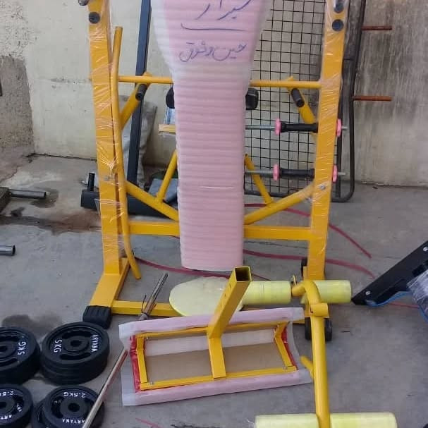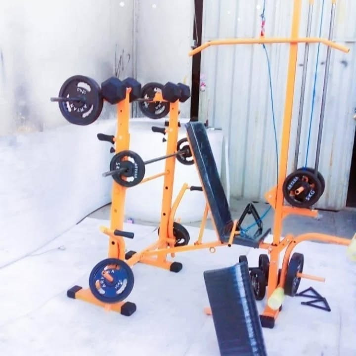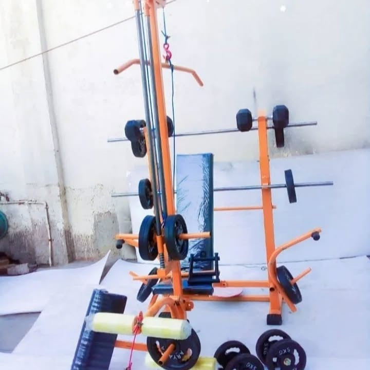 دستگاه بدنسازی ۵۲ کاره پروفیل ۶۰در۶۰ فول آپشن تقویت شده عرض ۹۰ طول ۱۶۰سانت پایه پروفیل درپوش خور لاستیک داره جلوپا پشت پا بلبرینگی تشک دستگاه دوبل سیم کش دستگاه قلاب جرثقیل همراه با ست ۳۰ کیلو وزنه یک میله هالتر صاف یک جفت دسته دمبل متغیر