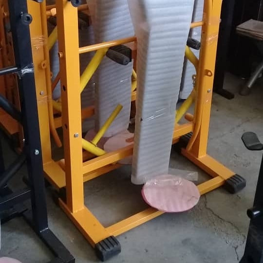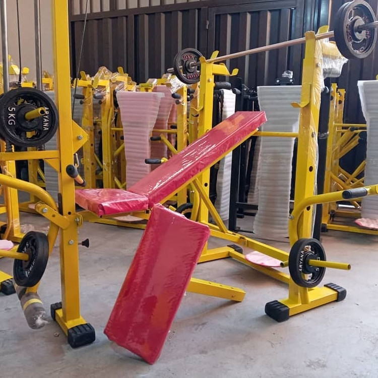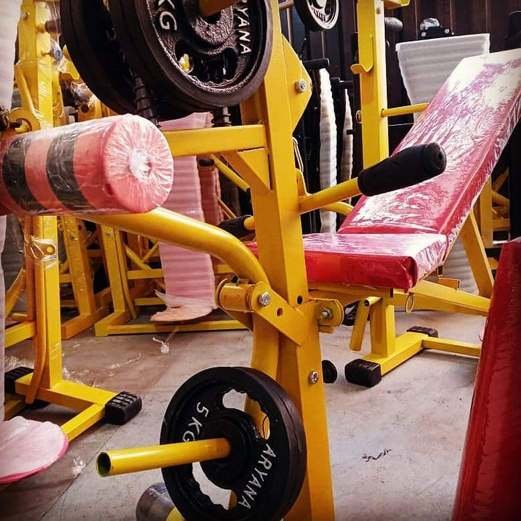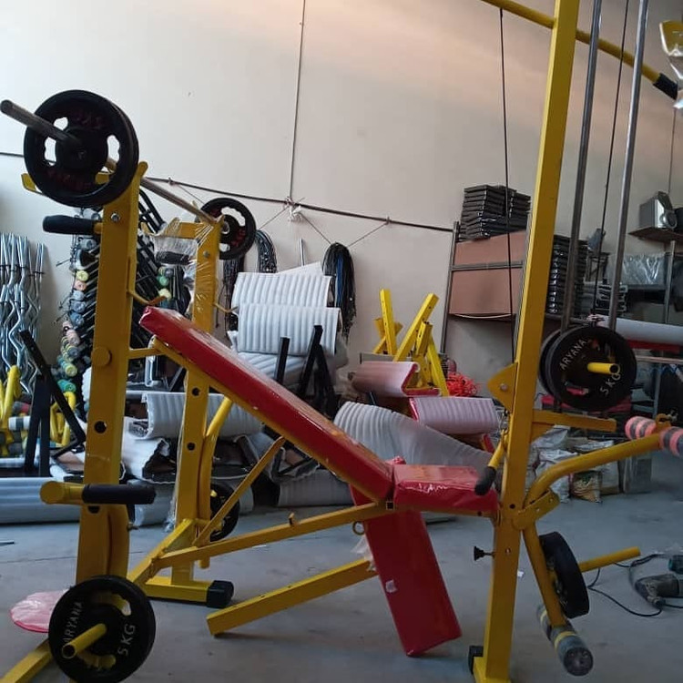 دستگاه بدنسازی فول آپشن تقویت شده با عرض ۹۰ و طول ۱۶۰ سانت، دارای پایه پروفیل با درپوش لاستیکی، جلوپا، پشت پا بلبرینگی، تشک دوبل و سیم کش، همراه با ست ۳۰ کیلو وزنه و یک میله هالتر صاف
